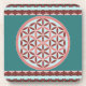 This captivating design features the iconic Flower of Life, an ancient symbol of sacred geometry composed of interlocking circles forming a harmonious floral pattern. Centred within a soft pink and white double-bordered circle, the design rests on a rich teal blue background.