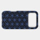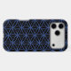 The flower of life symbol in a repeat pattern in blue detail on a black background.