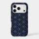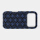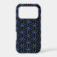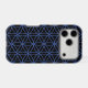 The flower of life symbol in a repeat pattern in blue detail on a black background.