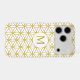 The flower of life symbol in a repeat pattern with a center circled initial for a personalized item in gold detail on a white background.