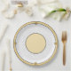 The cheerful, Art Deco inspired, original digital painting by Leslie Sigal Javorek adorning this paper plate features a stylized flower of pale grey, sunflower yellow, plus accents of cherry red & teal outlined in black that is set against a background of solid goldenrod, black & white stripes.