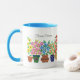 A white ringer mug with powder blue lip and handle and a row of pots of colourful flowers, from a handpainted paper collage by Judy Adamson. Customisable.