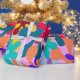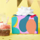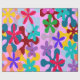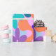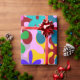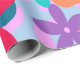 This wrapping paper has a 1970s retro design of overlapping flowers in red, blue, purple, yellow, orange, and red. Colourful, bright, and fun.