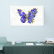 Jewelry, blue, sapphire, sparkling flower butterfly with wing decorated with blue, precious flowers with gold leaves on white background.