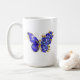 Jewellery, blue, sapphire, sparkling flower butterfly with wing decorated with blue, precious flowers with gold leaves on white background.