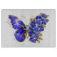 Jewellery, blue, sapphire, sparkling flower butterfly with wing decorated with blue, precious flowers with gold leaves on white background.