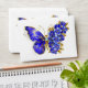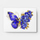 Jewellery, blue, sapphire, sparkling flower butterfly with wing decorated with blue, precious flowers with gold leaves on white background.