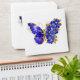 Jewellery, blue, sapphire, sparkling flower butterfly with wing decorated with blue, precious flowers with gold leaves on white background.
