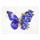 Jewellery, blue, sapphire, sparkling flower butterfly with wing decorated with blue, precious flowers with gold leaves on white background.
