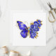Jewellery, blue, sapphire, sparkling flower butterfly with wing decorated with blue, precious flowers with gold leaves on white background.