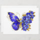 Jewelry, blue, sapphire, sparkling flower butterfly with wing decorated with blue, precious flowers with gold leaves on white background.