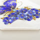 Jewellery, blue, sapphire, sparkling flower butterfly with wing decorated with blue, precious flowers with gold leaves on white background.