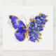 Jewellery, blue, sapphire, sparkling flower butterfly with wing decorated with blue, precious flowers with gold leaves on white background.