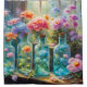 This shower curtain features a beautiful scene of flower vases filled with stunning, vibrant blooms resting on a windowsill. Pastel colours, soft design. Beautiful bathroom accessory in vintage look!
