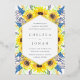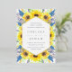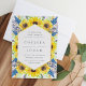 Our Flowerfields wedding invitation surrounds your wedding day details with a geometric gold foil frame flanked by yellow watercolor sunflowers and blue and purple buds. A beautiful choice in cheerful, vibrant hues for summer or country weddings.