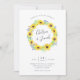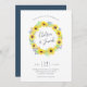 Rustic elegant floral wedding invitations feature a wreath of yellow watercolor sunflowers, tiny blue and purple buds, and green leaves, encircling your names in chic handwritten lettering. Personalize with your wedding details beneath.