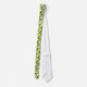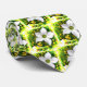 This lively tie features a repeating pattern of a white flowering tobacco flower with very pale mauve tints and a light green centre. A second bud is about to open. Both are set against a field of golden calendulas and green foliage.