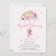 A pretty invitation for a bridal or baby shower with an umbrella made of pink and blue flowers with green leaves. A pink bow with flowers is tied to the handle. The soft pink background has a subtle striped pattern and falling flowers and pink petals. (Graphics AMBillustrations ©2017)