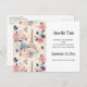 Wedding (or other) save the date postcard with a lovely French themed pattern. Pretty flowers and an Eiffel tower and butterflies. Colours include pink, blue, peach and cream.