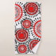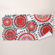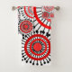 This towel set has a design of rings and circles in shades of red with black lines crossing behind them forming flowers on a field of white.