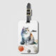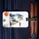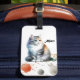 Cat enthusiasts will adore this charming luggage tag showcasing a long-haired, fluffy, multicolored cat with striking blue eyes. The bottom is adorned with a border of paint splotches for added visual appeal. The word 'meow' is customizable and can be altered or omitted according to preference.