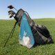This golf towel is blue with a fluffy white rabbit sitting on a grey ground among white and orange flowers. Customize your text with the template.