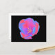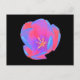 This pretty postcard features a beautiful photograph of a tulip. The photograph has been artificially coloured resulting in a fluorescent tulip. The outer petals are coloured with shades of blue and red, while the inner petals show shades of pink and purple. The very centre of the flower is bright yellow. The simple black background shows off the stunning beauty of this flower.