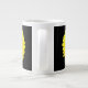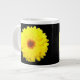 This awesome mug features a photo of a pretty fluorescent yellow marigold flower on a black background.