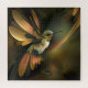 A futuristic digital depiction of a hummingbird in soft gold, green and pale orange with fanciful wings and tailfeathers. Fantasy bird. by Kat McCarthy