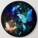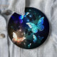Fabulous, glowing, blue and yellow, night butterfly on dark background.