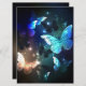 Fabulous, glowing, blue and yellow, night butterfly on dark background.