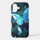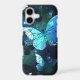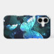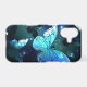 Fabulous, glowing, blue and yellow, night butterfly on dark background.