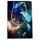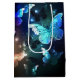 Fabulous, glowing, blue and yellow, night butterfly on dark background.