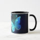 Fabulous, glowing, blue and yellow, night butterfly on dark background.