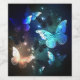 Fabulous, glowing, blue and yellow, night butterfly on dark background.