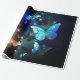 Fabulous, glowing, blue and yellow, night butterfly on dark background.