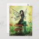 Fantasy card with a cute forest fairy sitting on a fly agaric.