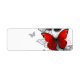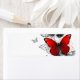 Flock of flying, realistic, red and black morpho butterflies on white background with drops of paint.