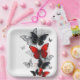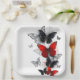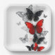 Flock of flying, realistic, red and black morpho butterflies on white background with drops of paint.