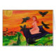 A little witch flying on a carpet toward a Halloween party
