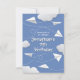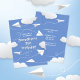 This fun paper airplane themed birthday party invitation card for an aspiring aeronautical engineer features various illustrated folded white paper airplanes with whimsical curvy dashed-line flight trails amongst puffy white clouds on a customizable blue background - personalize with your party details - by katz_d_zynes