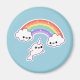 Super cute baby narwhal flying under a sparkle rainbow with happy clouds.