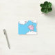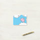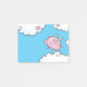 A note pad featuring a digital cartoon pink pig with little white wings, dances on clouds embellished with hearts up in the bright blue sky