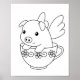 Adorable flying pig with angel-like wings is sitting in a teacup decorated with flowers. Made for easy colouring.