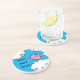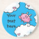 A customisable coaster template featuring a digital cartoon pink pig with little white wings, dances on clouds embellished with hearts up in the bright blue sky.