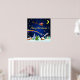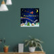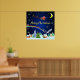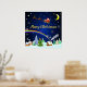 Beautiful snowscapes with Christmas trees, houses, a snow man, and a rainbow over the snow falling from the sky. Santa Claus flying over the Crescent moon on Christmas night.