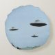 A watercolor painting of three flying saucer UFOs over the mountains adorns this pillow!
