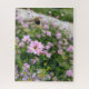 Enjoy this jigsaw puzzle with a hungry bumble bee flying off to the next flower for food. These beautiful purple and pink flowers are fitting for any nature or garden lover.