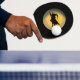 Ping Pong Paddle printed with Flying Wicked Witch Silhouette By TheFabricSeal is a scary looking sorceress with her flying witch broom and her pointed conical shaped witch hat as she quickly streaks through the dark of night sky and passing in front of the full yellow Halloween moon.