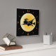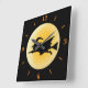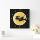 Round Wall Art Clock and home furnishing decor accessory with Flying Wicked Witch Silhouette By TheFabricSeal is a scary looking sorceress with her flying witch broom and her pointed conical shaped witch hat as she quickly streaks through the dark of night sky and passing in front of the full yellow Halloween moon.